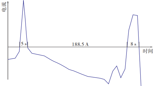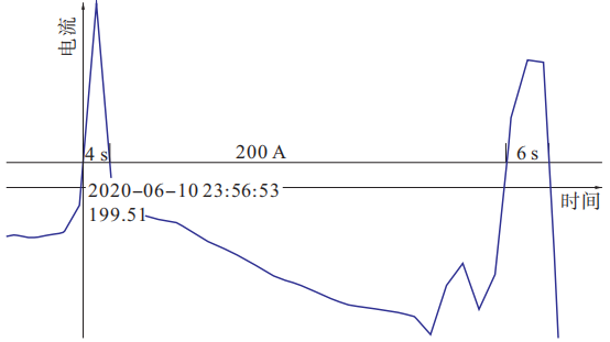 堵轉(zhuǎn)保護(hù)功能的主要特點(diǎn)是可以在電動(dòng)機(jī)啟動(dòng)完成后再投入,因此,可以不用考慮啟動(dòng)的影響。如果將4#入窯提升機(jī)堵轉(zhuǎn)保護(hù)電流定值改為200A,時(shí)間定值改為2s,那么此次故障有兩個(gè)電流波峰均可以啟動(dòng)保護(hù)動(dòng)作。一次超過(guò)200A電流持續(xù)時(shí)間為4s,二次超過(guò)200A電流持續(xù)時(shí)間為6s,見(jiàn)圖5。