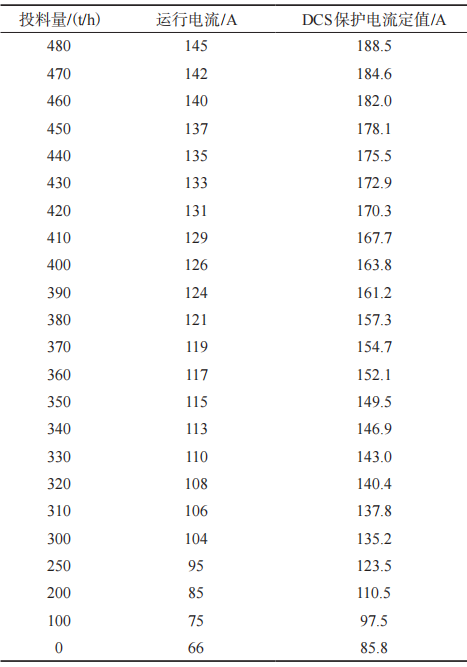 按6月10日晚故障情況做驗(yàn)證,當(dāng)晚投料量477t/h,對(duì)應(yīng)關(guān)系表中480t/h,保護(hù)電流188.5A,延時(shí)2s。